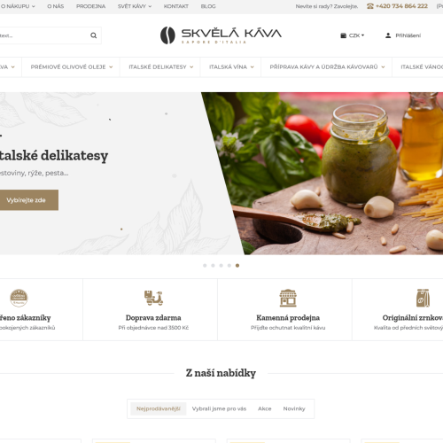Jsme specialisté na italskou kávu a prémiové italské potraviny. Na e-shopu www.skvela-kava.cz nebo kamenné prodejně v Kyjově můžete zakoupit hlavně zrnkovou kávu, ale také prémiový olivový olej, sušená rajčata, kvalitní těstoviny, italská vína a prosecco. Prostě vše, co potřebujete do středomořské kuchyně.