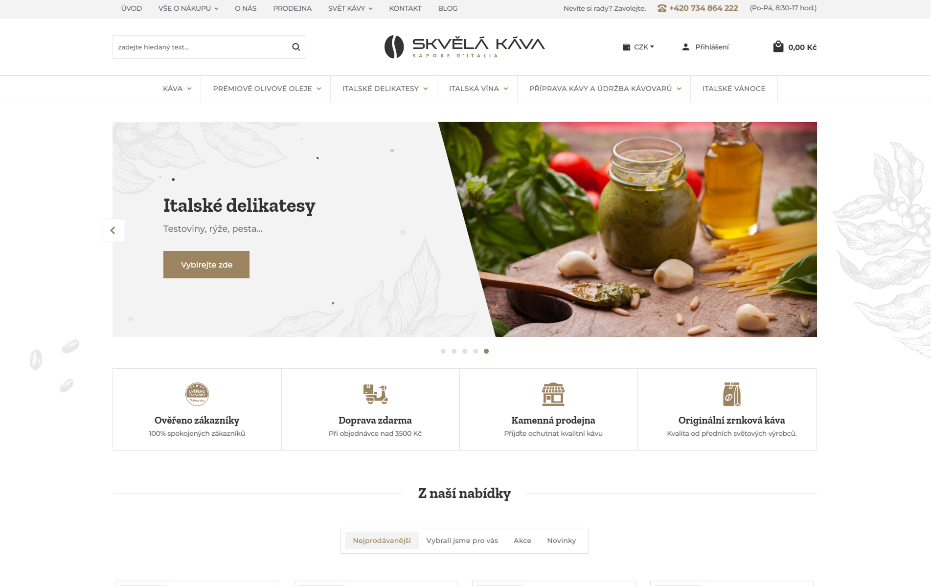 Jsme specialisté na italskou kávu a prémiové italské potraviny. Na e-shopu www.skvela-kava.cz nebo kamenné prodejně v Kyjově můžete zakoupit hlavně zrnkovou kávu, ale také prémiový olivový olej, sušená rajčata, kvalitní těstoviny, italská vína a prosecco. Prostě vše, co potřebujete do středomořské kuchyně.