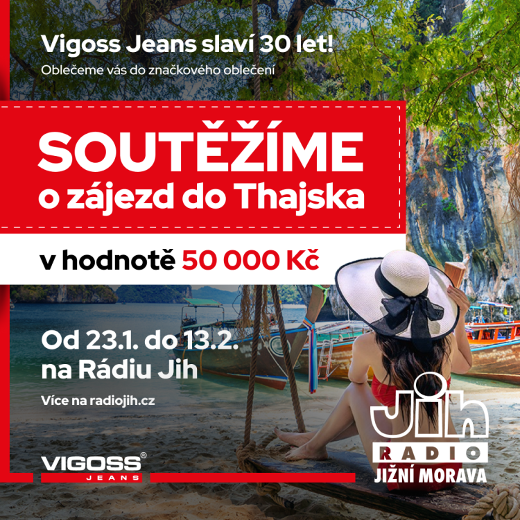 Na Rádiu Jih soutěžíme každý všední den o poukázky do prodejen módní značky Vigoss Jeans a 13. února vás pošleme na letecký all-inclusive zájezd do Thajska v hodnotě 50 000 Kč!